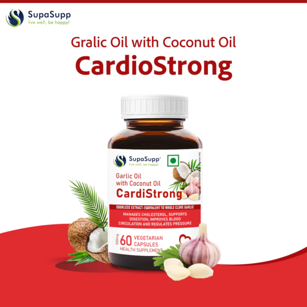 SupaSupp Garlic Oil With Coconut Oil & CardiStrong 500mg (60 Veg Capsules)Â For Cholesterol, Digestion, Blood Circulation, Blood Pressure