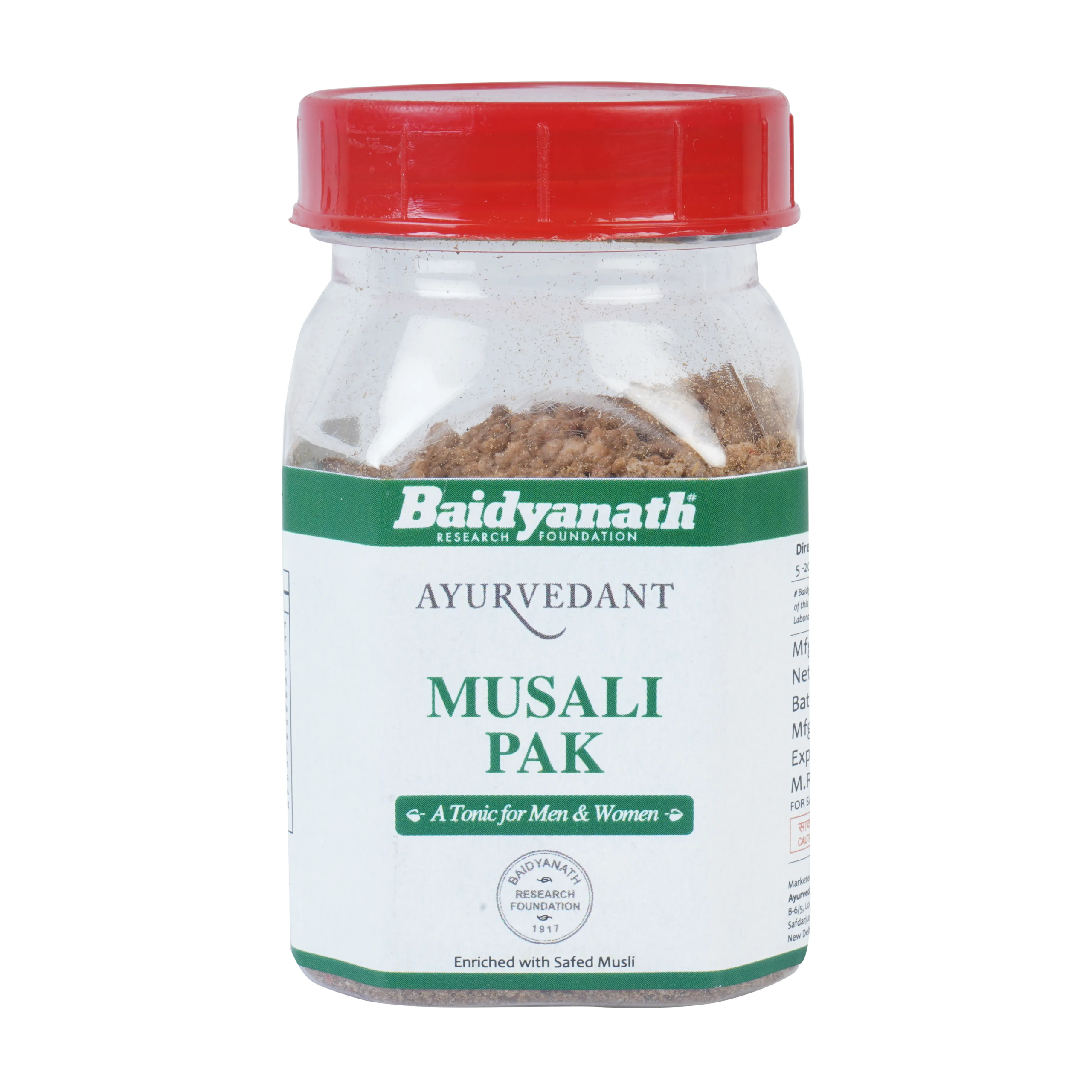 Baidyanath (Jhansi) Ayurvedant Musali Pak Powder is an ayurvedic concoction that acts as a nourishing tonic and a physical rejuvenator. It helps in restoring physical strength and helps sportspeople by improving endurance and performance.